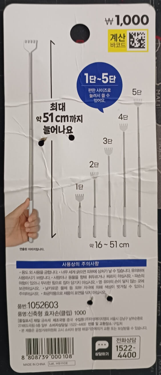 재질: 다이소 효자손은 종류가 몇가지 있는데 이번에 구매한 제품은 금속재질의 5단