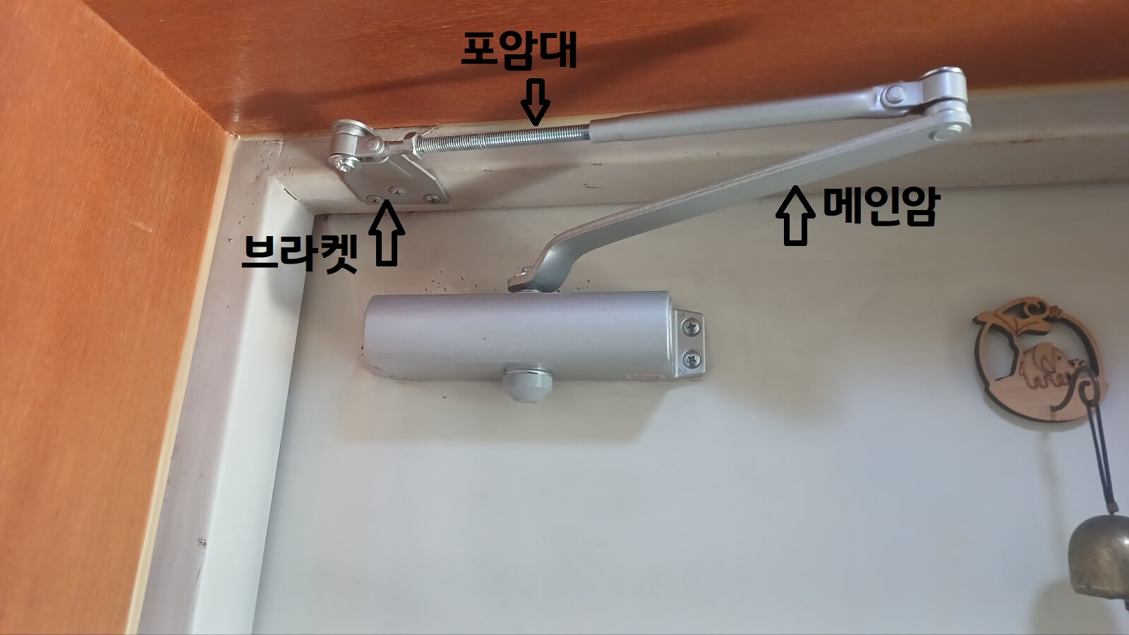 설치는 특별한 거 없고 기존 도어 클로저 떼내고 그 위치 그대로 설치를 했는데요. 현관 틀에 고정하는 브라켓 위치가 약간 안 맞아서 그런지 포암대가 안 맞아서 포암대는 기존에 있던 거 재활용했습니다.
