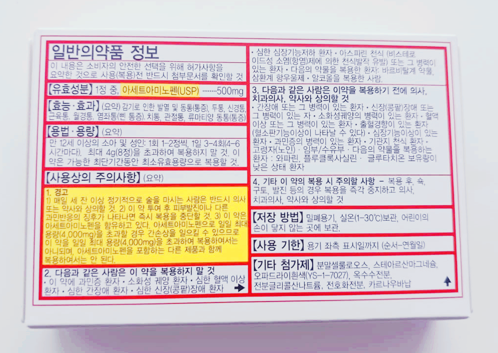 - 중복 복용 주의: 타이레놀은 다양한 복합 감기약이나 진통제에도 포함되어 있을 수 있습니다. 따라서 여러 약물을 동시에 복용할 경우 아세트아미노펜 과다 복용의 위험이 있으므로, 성분을 확인하여 중복 복용을 피해야 합니다.